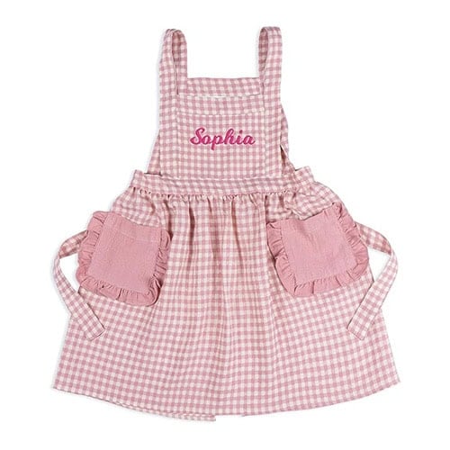 This sweet customized apron makes baking even more fun, and the gingham and ruffle design couldnโt be any cuter. Itโs the perfect little helper outfit for cookie nights and messy kitchen moments.