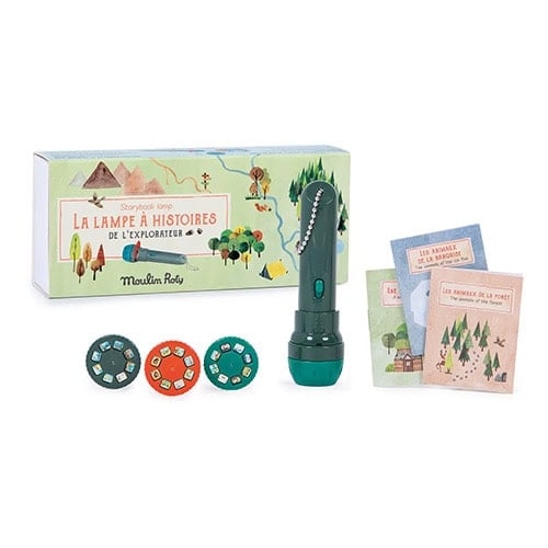 Turn story time into an adventure with this beautifully illustrated story-torch set. Little ones can project slides onto the wall, flip through three mini books and learn the names of animals in French.