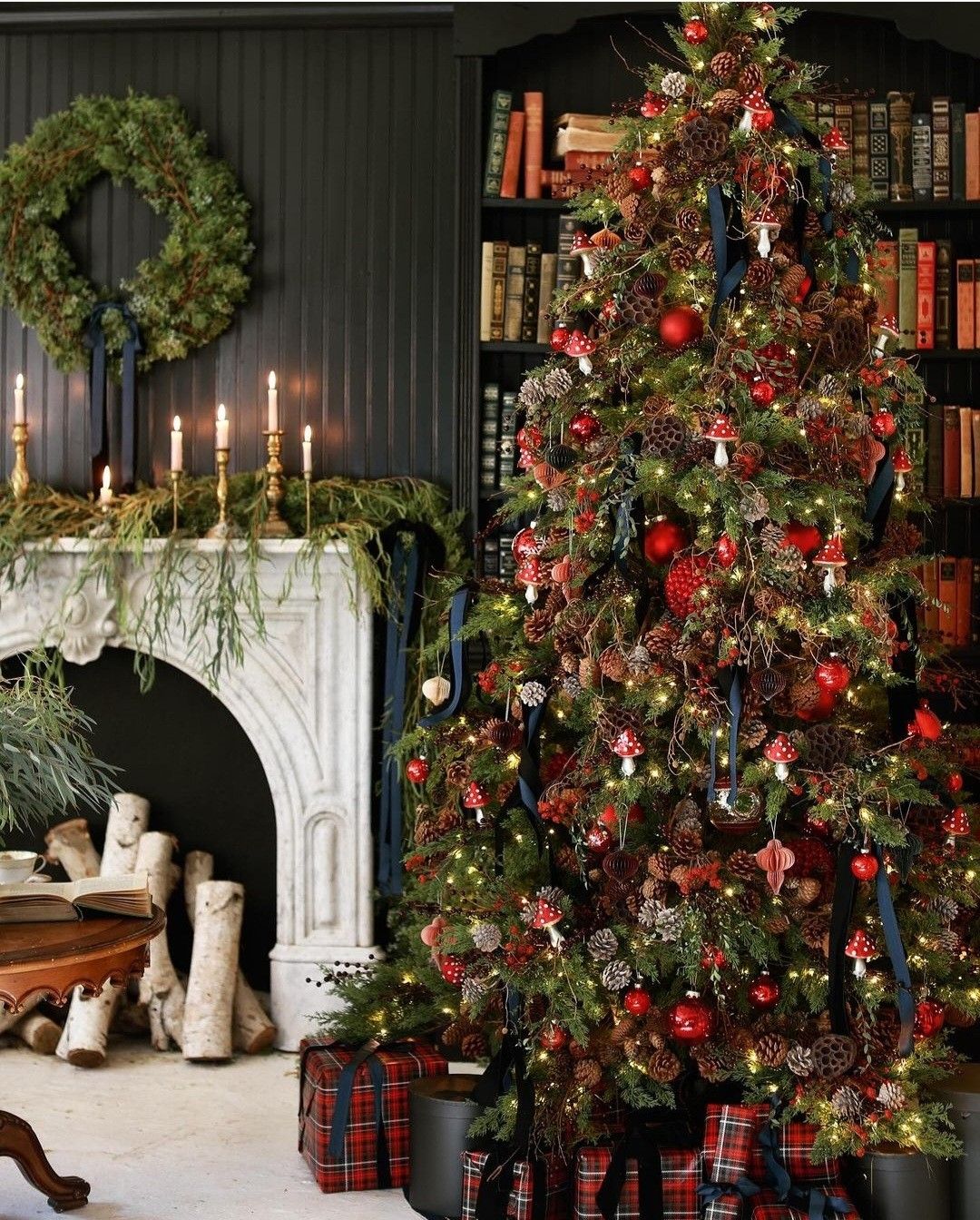 While itโs currently surging in popularity, this style is rooted in traditional elements of design: tartan plaid, bows, velvet, polished silver and brass, berries, rich reds, green and navy. You can also incorporate certain features while adding your own spin (like this elegant + rustic forest style below).