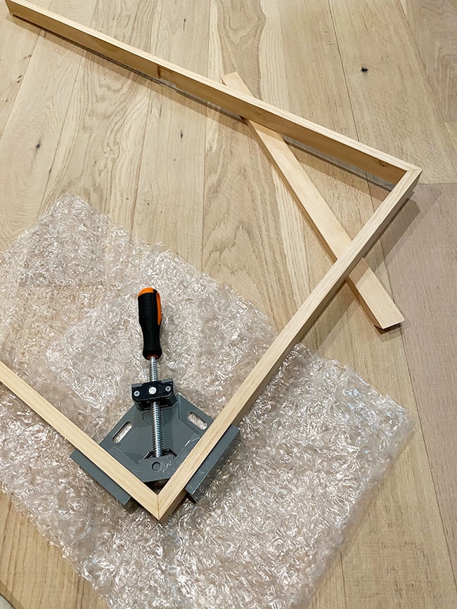 Now, it was time to build the frame! For our last DIY canvas frame we held the 1×2’s in place by hand when nailing them together, which managed to work, but I decide to (finally) step up our game and get one of these corner clamps.