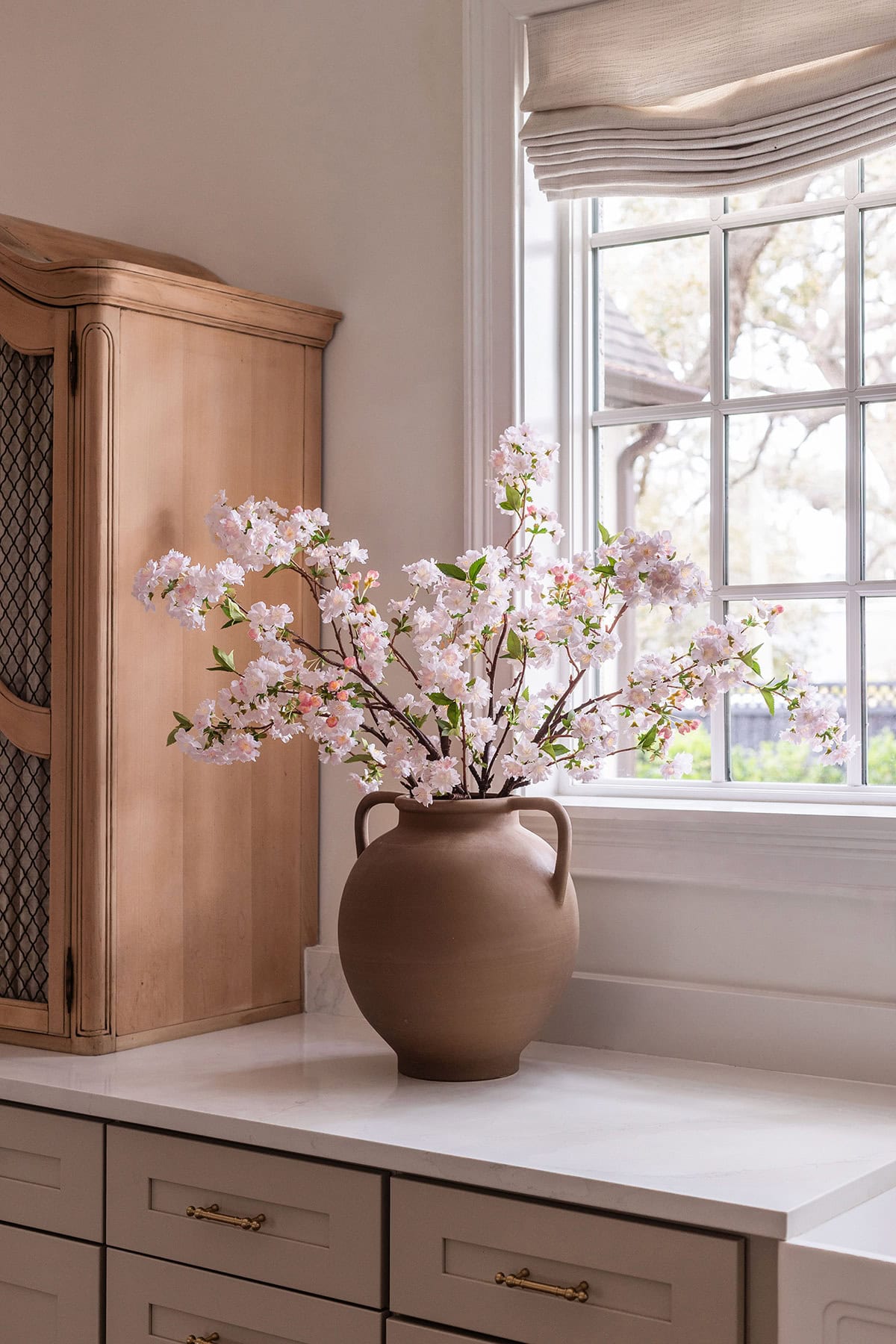 Cherry blossoms are popping up everywhere this year, and these 36″ branches in blush are one of the most realistic I’ve seen (they come in white, too). I used six in this large handled vase.