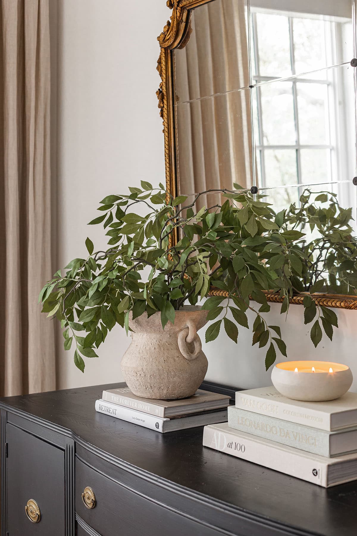 Hydrangeas are my go-to floral for styling these days (both preserved and faux). I’ve acquired quite the collection, and these $5 beauties are my new favorite. I ordered them in “brown” (they’re more mauve in person) and used 10 stems in a glazed ceramic vase for an extra full arrangement.