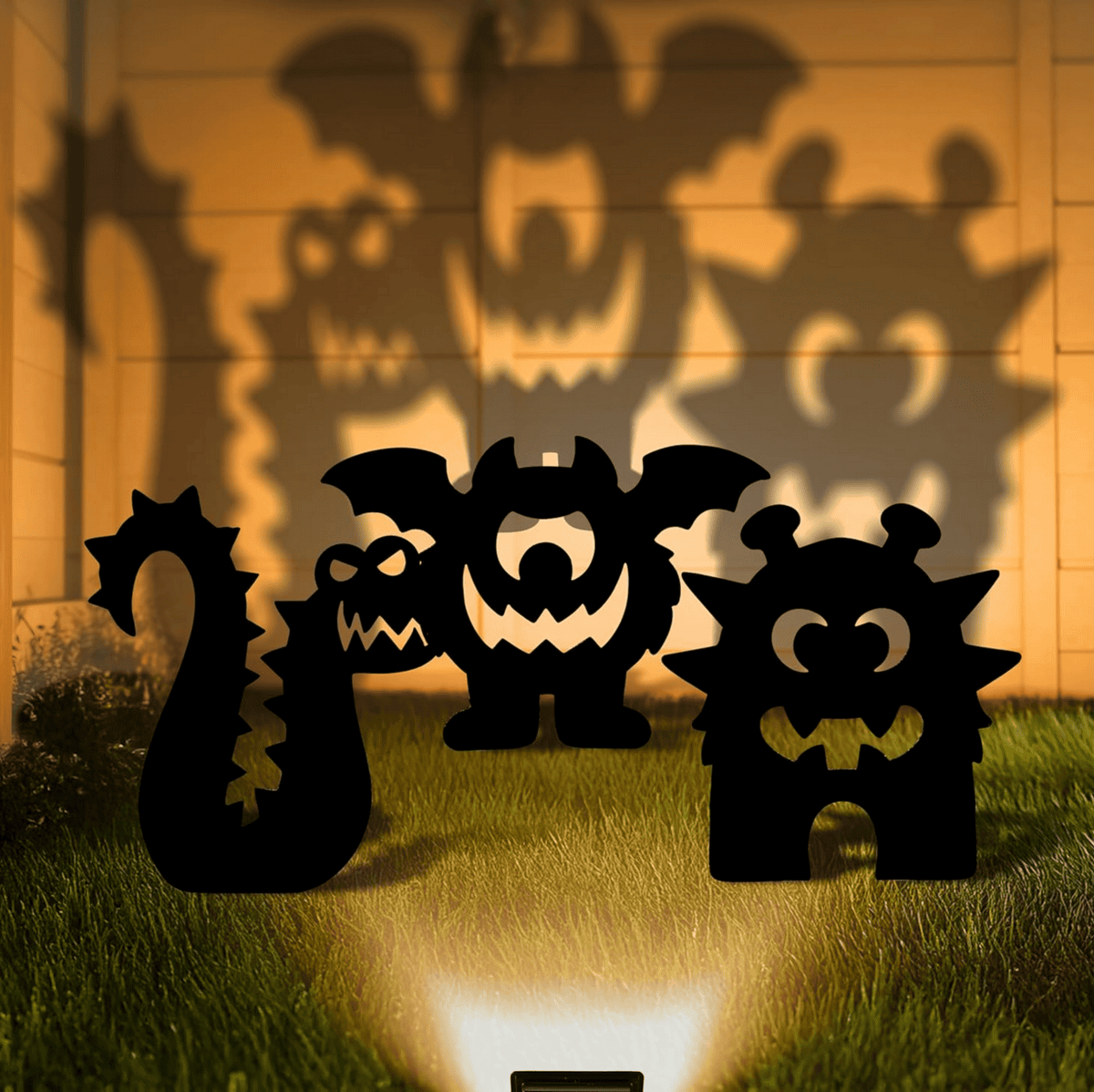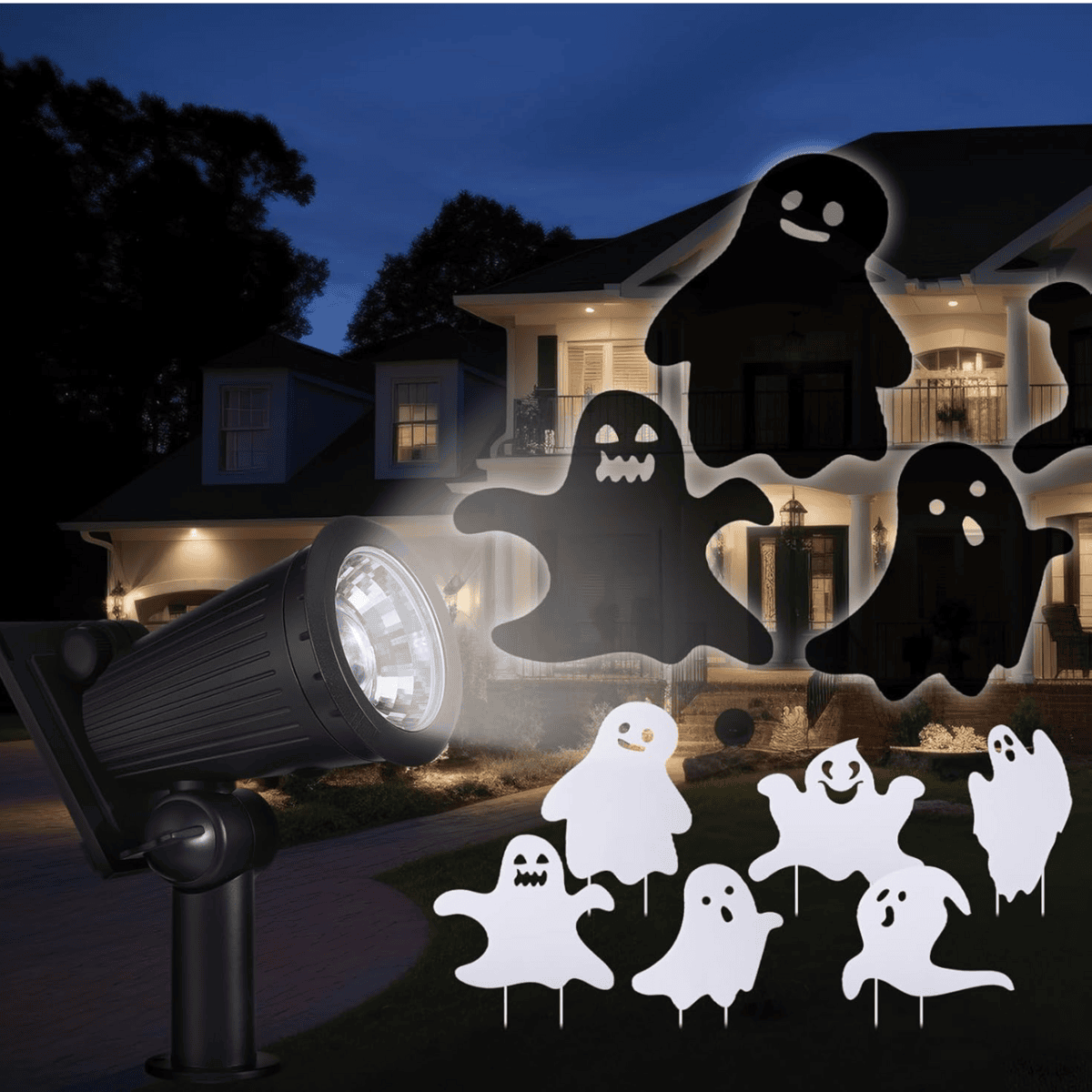 The ghosts are weather-resistant corrugated plastic and come with stakes to place them in the yard. You’ll have to spend some time making adjustments to the spotlight and ghosts to get them just right. Ours have held up great through wind and rainstorms.