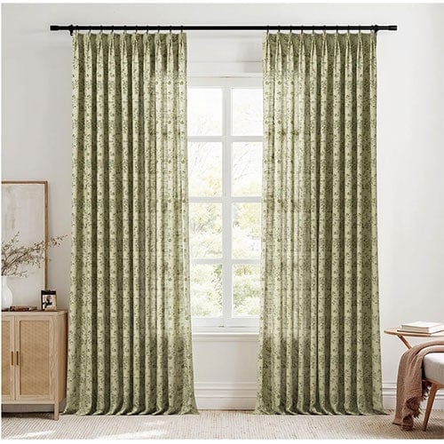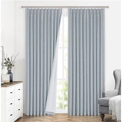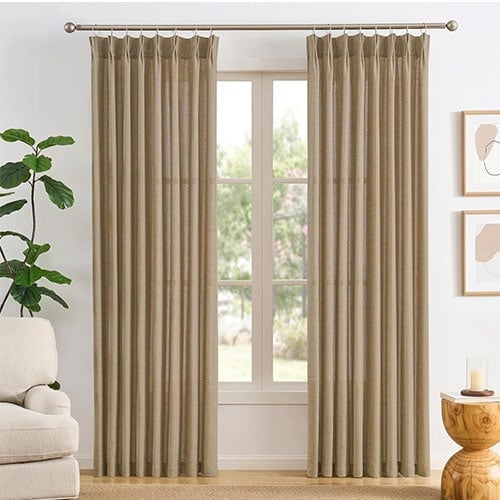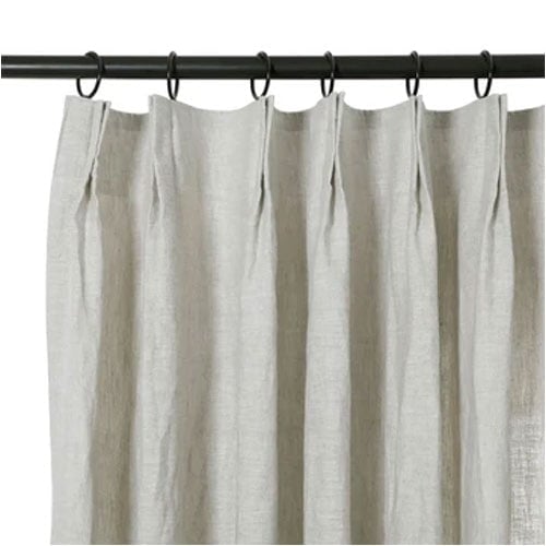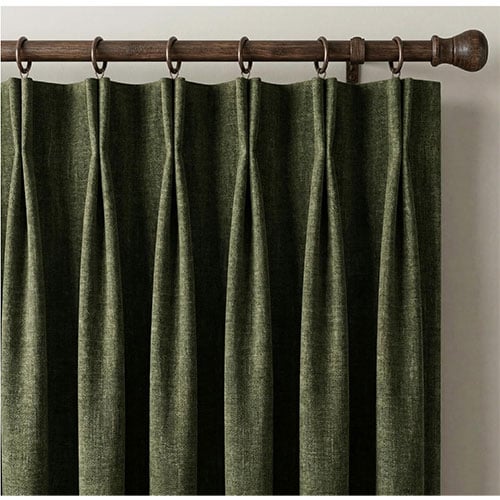 For a designer look, choose a pinch pleat header style. I avoid rod pocket, back tab, tab top and tie top as they don’t open and close as easily, and I grommet rings tend to cheapen the look of curtains.