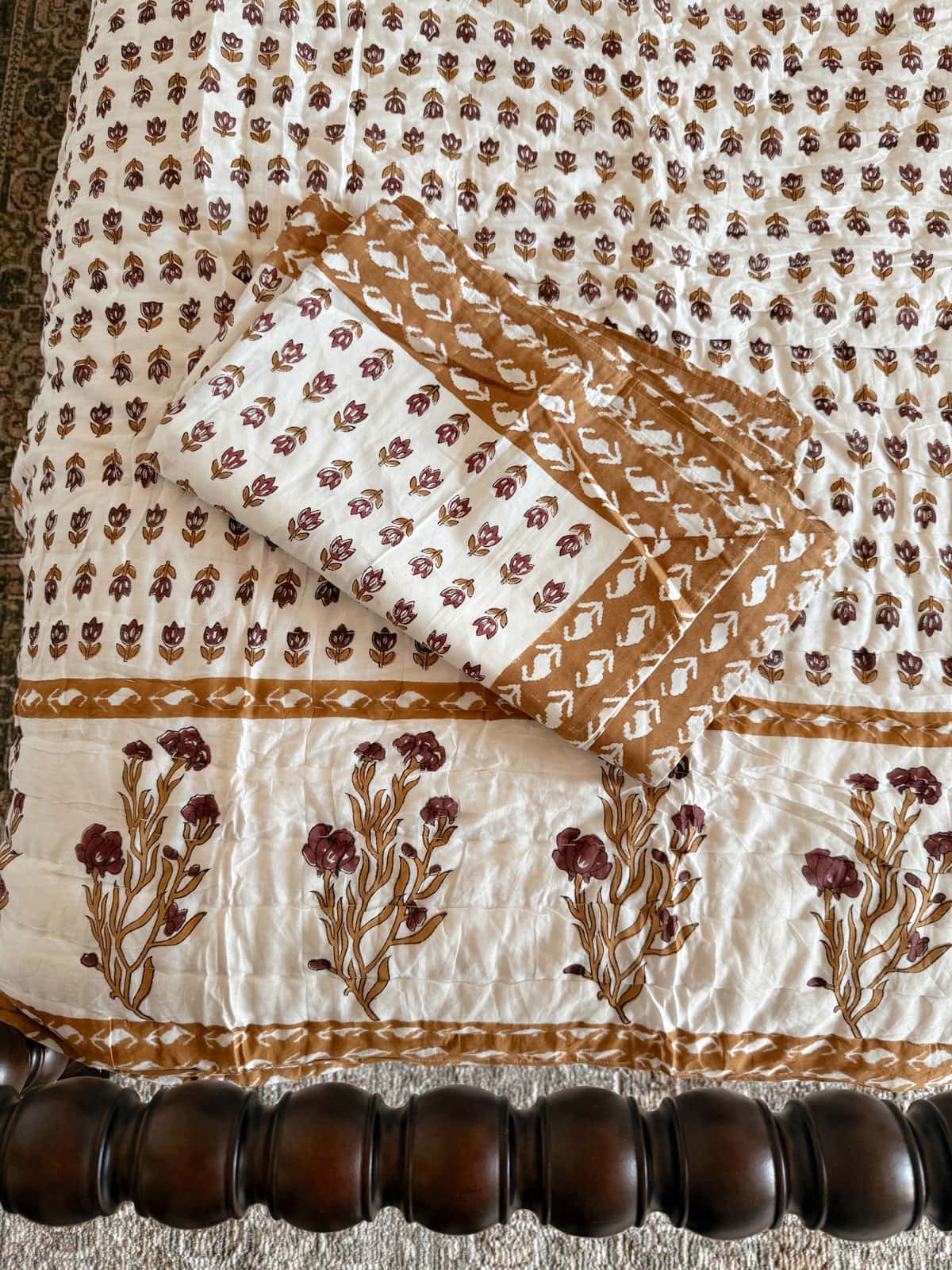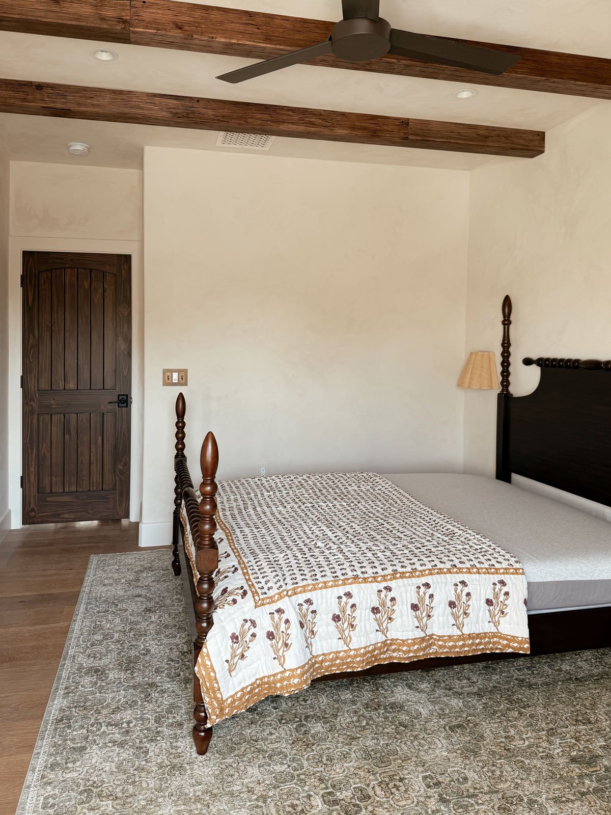 I tracked down this beautiful handmade block print quilt + sham set on Etsy. A bit of a splurge for me, but I think it’s one of those pieces that makes the room. Now I just need to decide on the rest of the bedding!