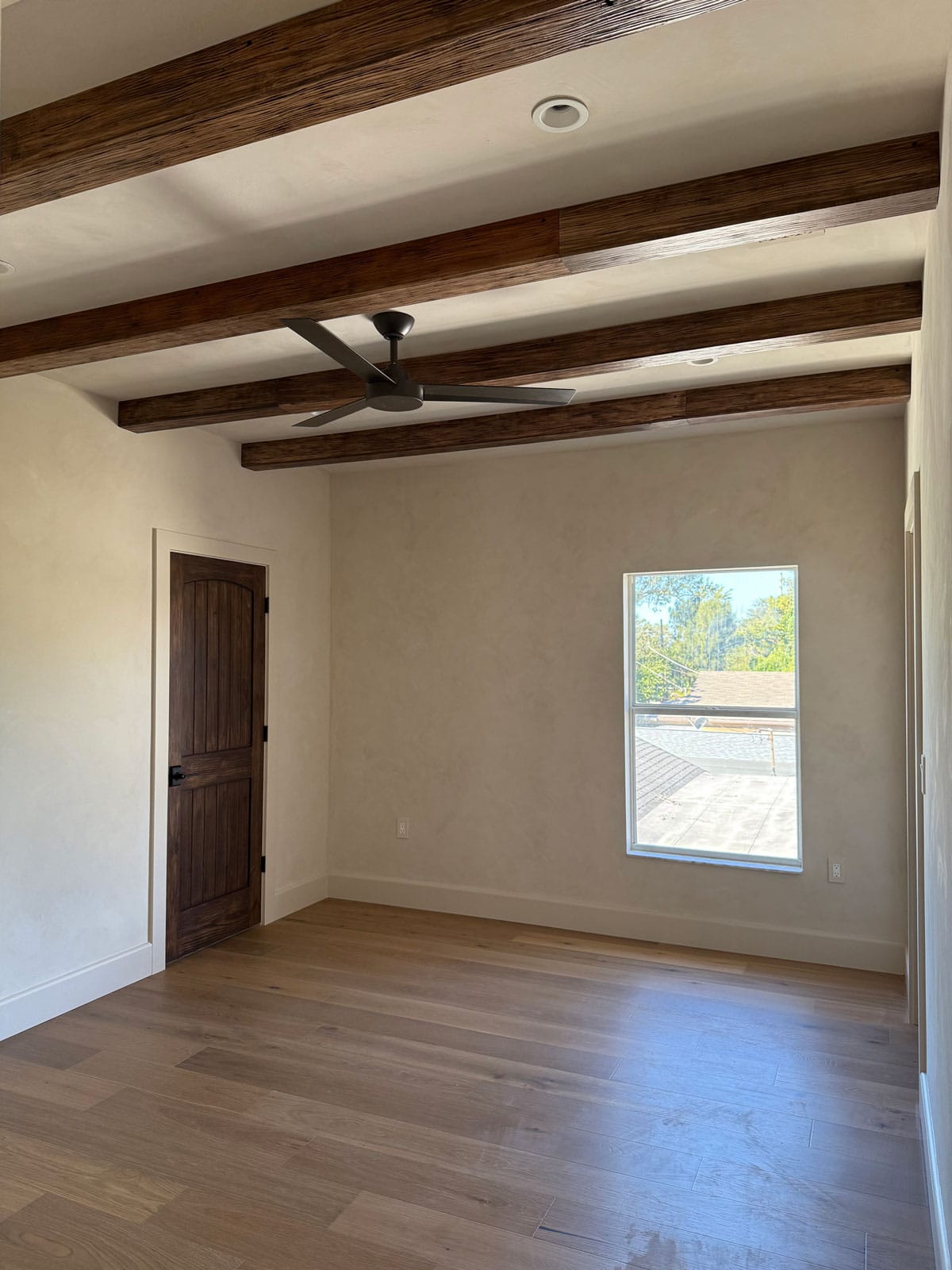 We replaced the carpet with white oak, upgraded the doors, hardware and moldings, and skim coated the walls. We also used the Vasari Fossil limewash to match the primary bedroom.