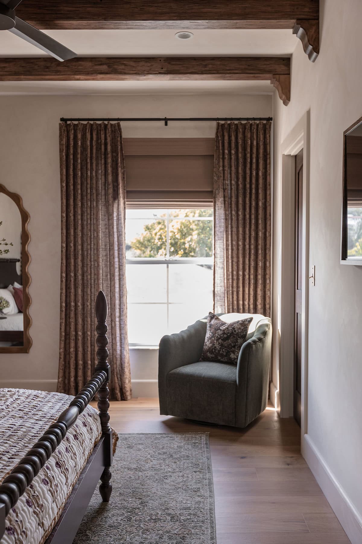 If the window treatments look familiar, this is the third time I’ve used these curtains! This time I got them in Copper. The blackout bamboo shades are from the same company, and I also used them in the primary bedroom.