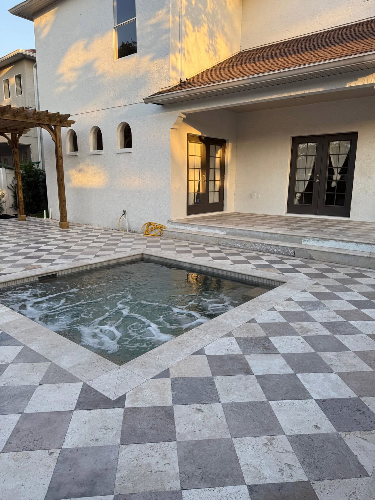 The primary features include: a 10×10′ heated plunge pool, checkerboard travertine pavers, outdoor covered kitchen, large wood pergola, pool lounge and dining area, podocarpus hedge perimeter.