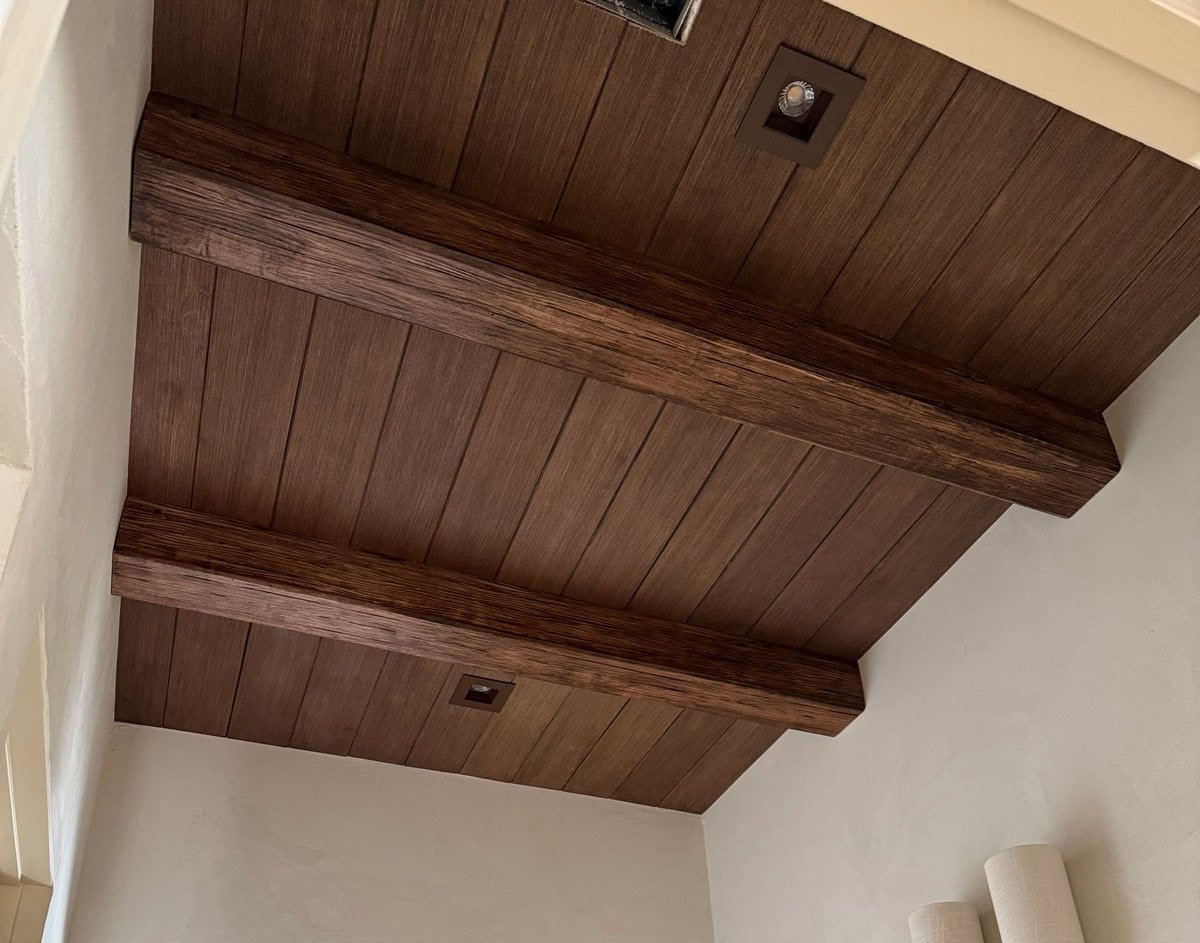 Update: here’s the finished ceiling! You can see how we did it in my DIY wood plank and beam tutorial: