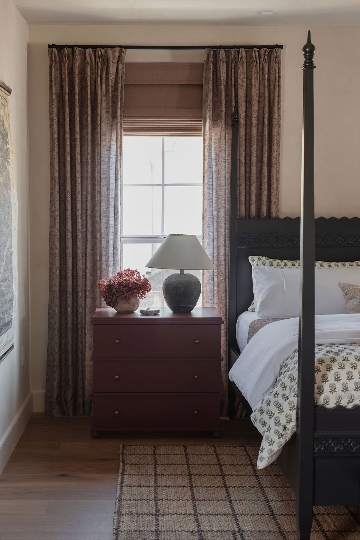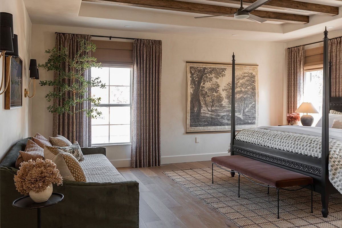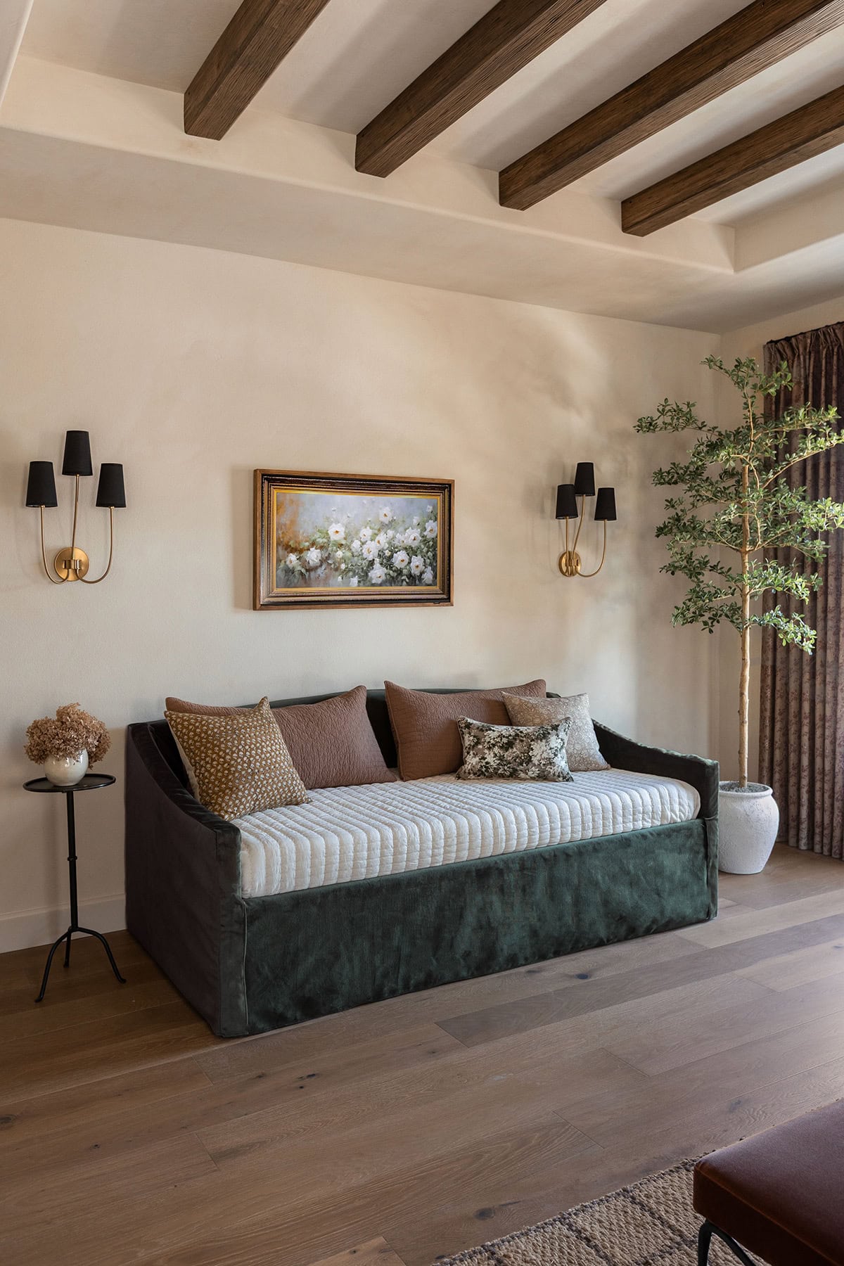 The vision for this space was similar to the “timeless, traditional Spanish” Queen bedroom, but with a more relaxed, lived-in feel. I imagined a cozy haven with warm neutrals, patterned textiles, rich wood tones and organic textures.