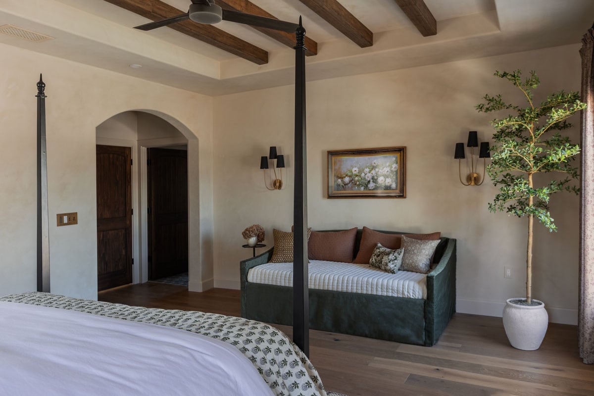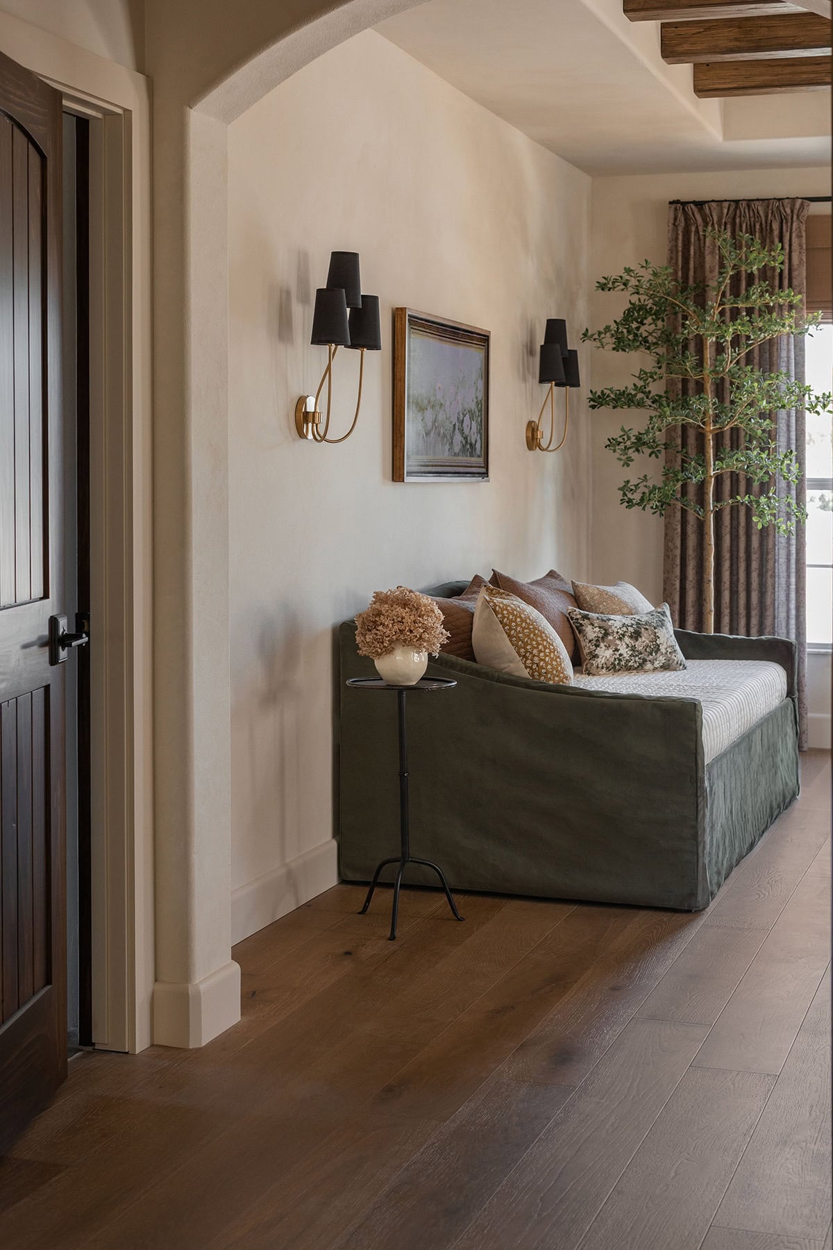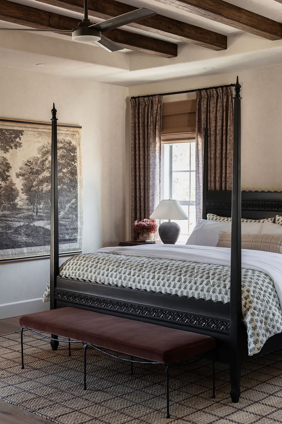 The vision for this space was similar to the “timeless, traditional Spanish” Queen bedroom, but with a more relaxed, lived-in feel. I imagined a cozy haven with warm neutrals, patterned textiles, rich wood tones and organic textures.