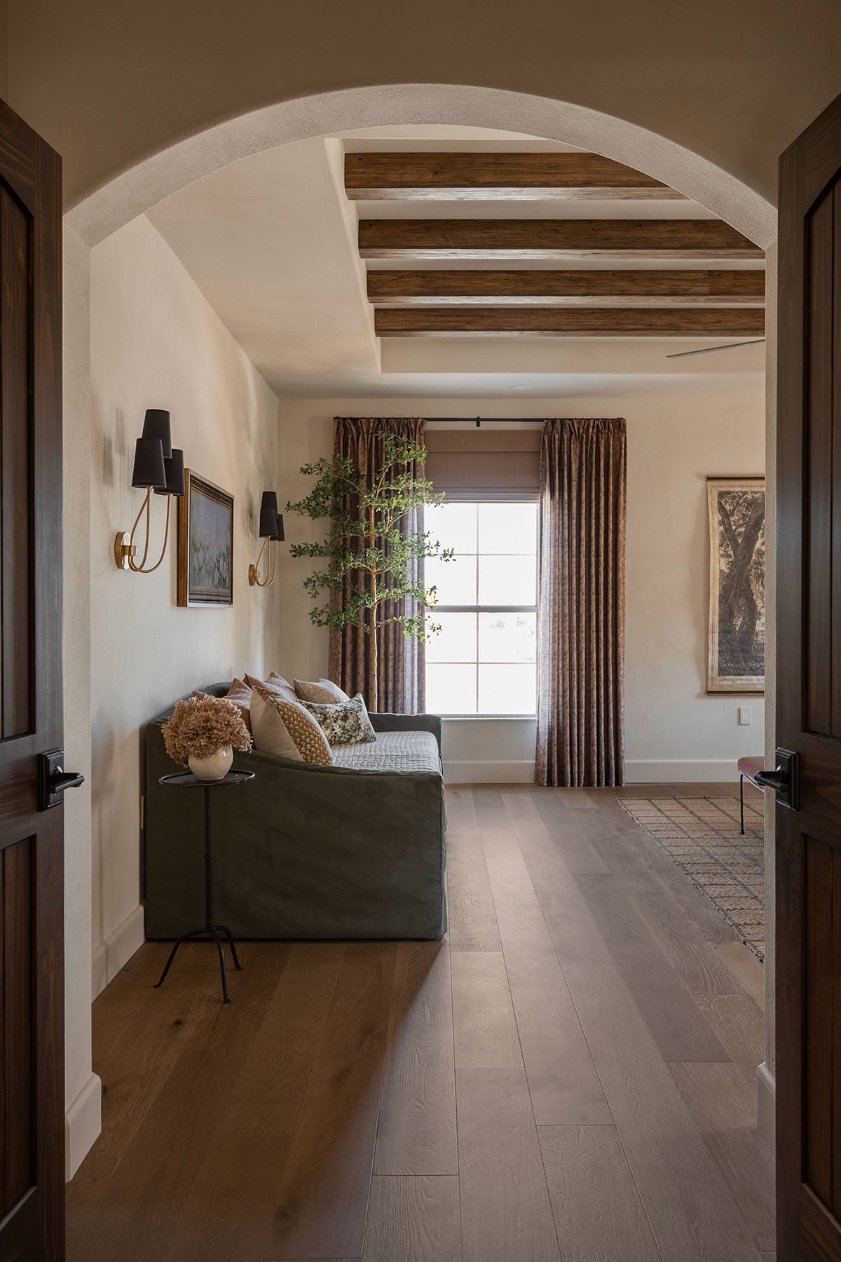 Here’s how the room looks from the other side. You can see the entrance past the arch, with the second door leading to the ensuite bathroom.