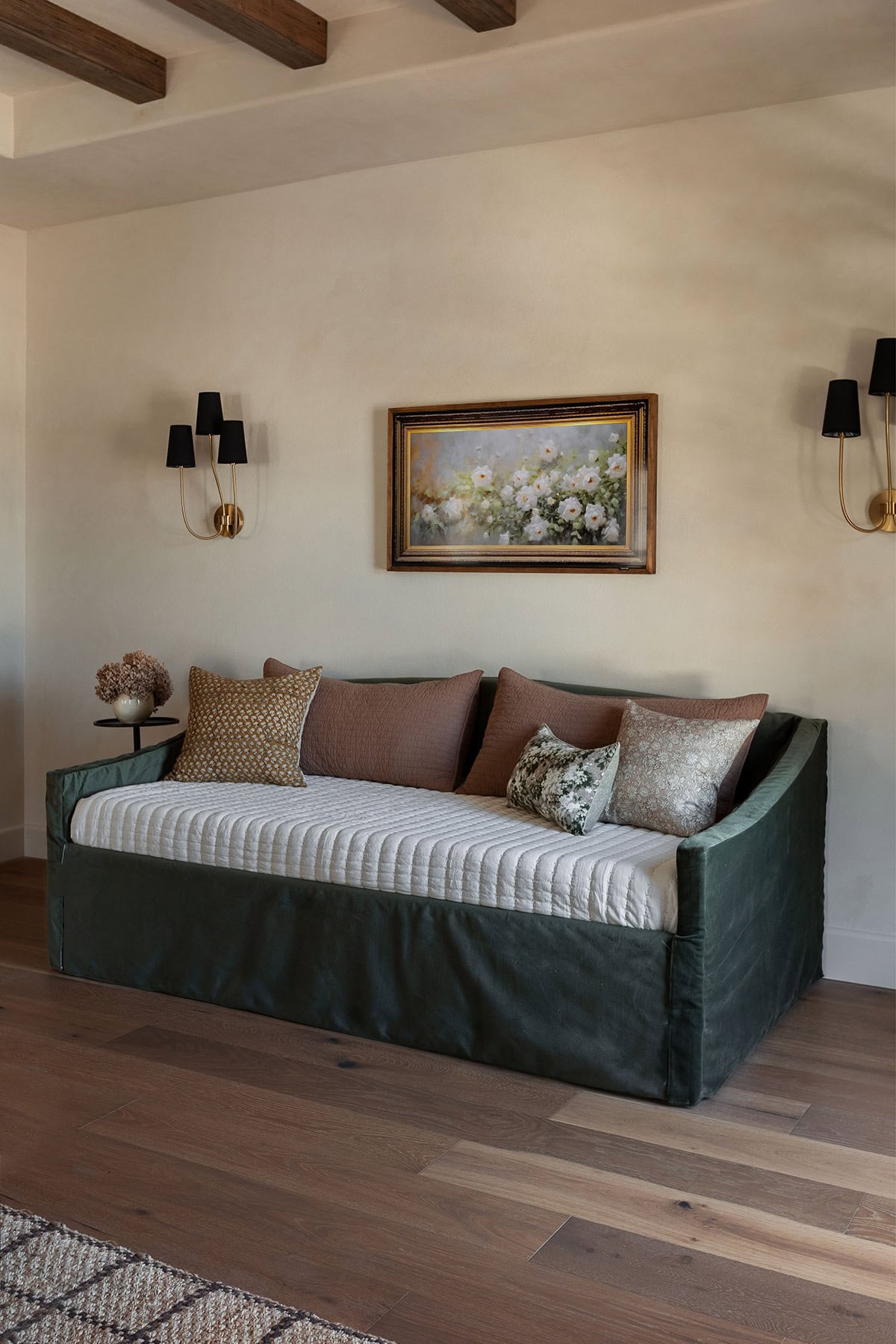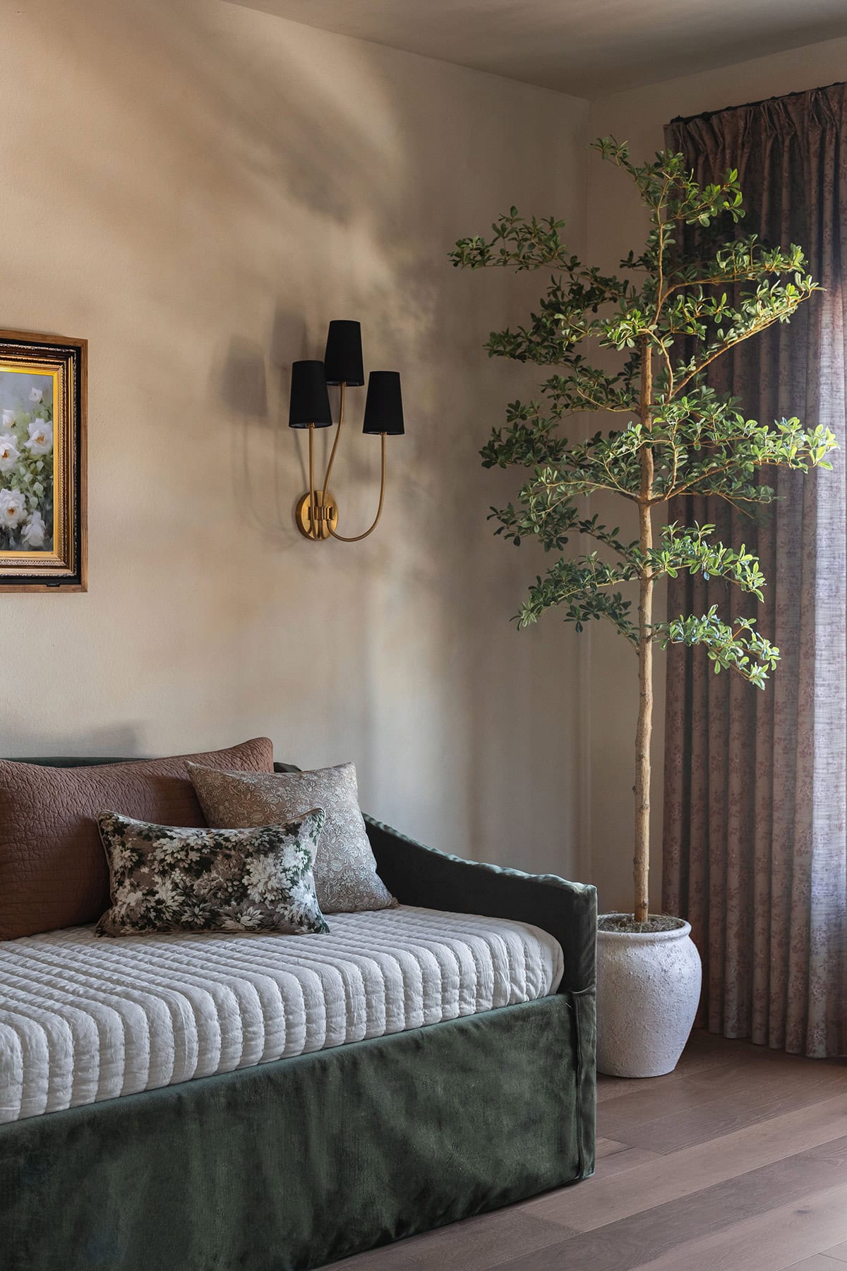 Tracking down a trundle bed to fit my specific vision proved to be more difficult. I couldn’t find what I wanted, so ended up ordering a daybed from Walmart and having a custom velvet slipcover made for it (there’s velcro on the sides to open up the trundle on the bottom).