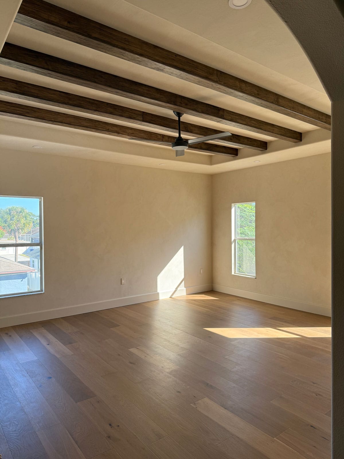 The walls were lime washed, DIY ceiling beams went up, white oak floors installed, and new trim and doors to get us to furnishing.