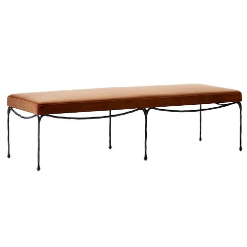 I found the prettiest terracotta velvet bench that’s a near perfect color match to the nightstands (it’s actually the longer version of the stools in the primary bathroom).